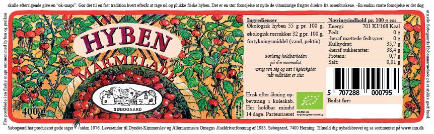 Ingredienser: Økologiske hyben, økologisk rørsukker, vand og pektin 400 gram